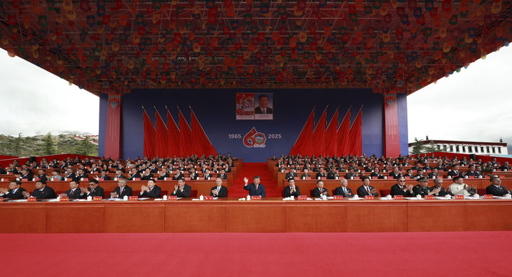古城拉薩彩旗飄揚,處處洋溢著(zhù)節日的氛圍。雄偉的布達拉宮下,搭建起藏式風(fēng)格的大會(huì )主席臺。主席臺上方中華人民共和國國徽和“西藏自治區成立60周年慶祝大會(huì )”橫幅十分醒目,背景墻上懸掛著(zhù)大慶會(huì )徽和“1965”“2025”字樣,10面紅旗分列兩側。主席臺對面的布達拉宮廣場(chǎng)上,身著(zhù)節日盛裝的各族群眾從四面八方匯聚到這里,手中揮動(dòng)著(zhù)紅旗,匯聚成一片歡樂(lè )的海洋。