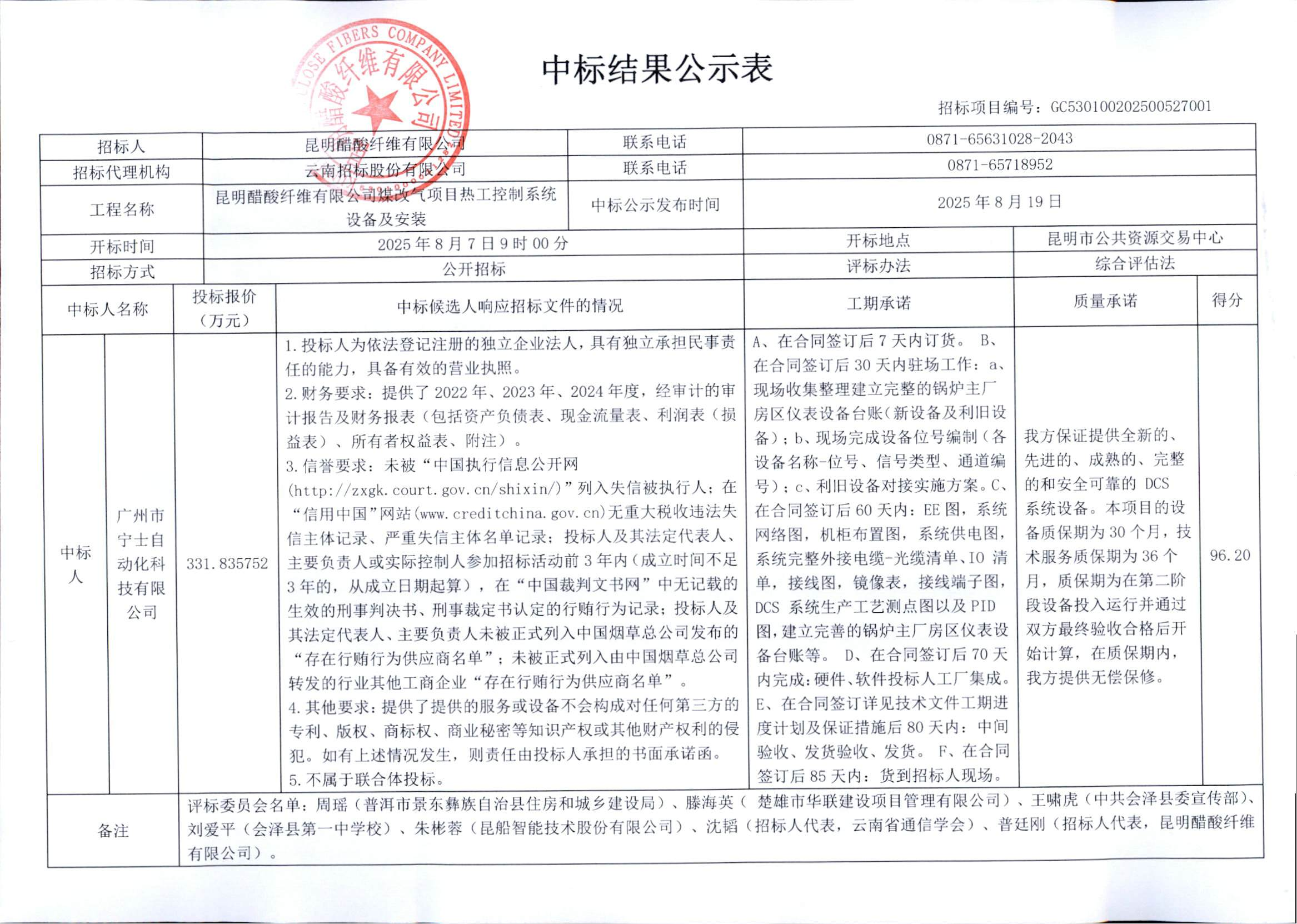 昆明醋酸纖維有限公司煤改氣項目熱工控制系統設備及安裝中標結果公示
